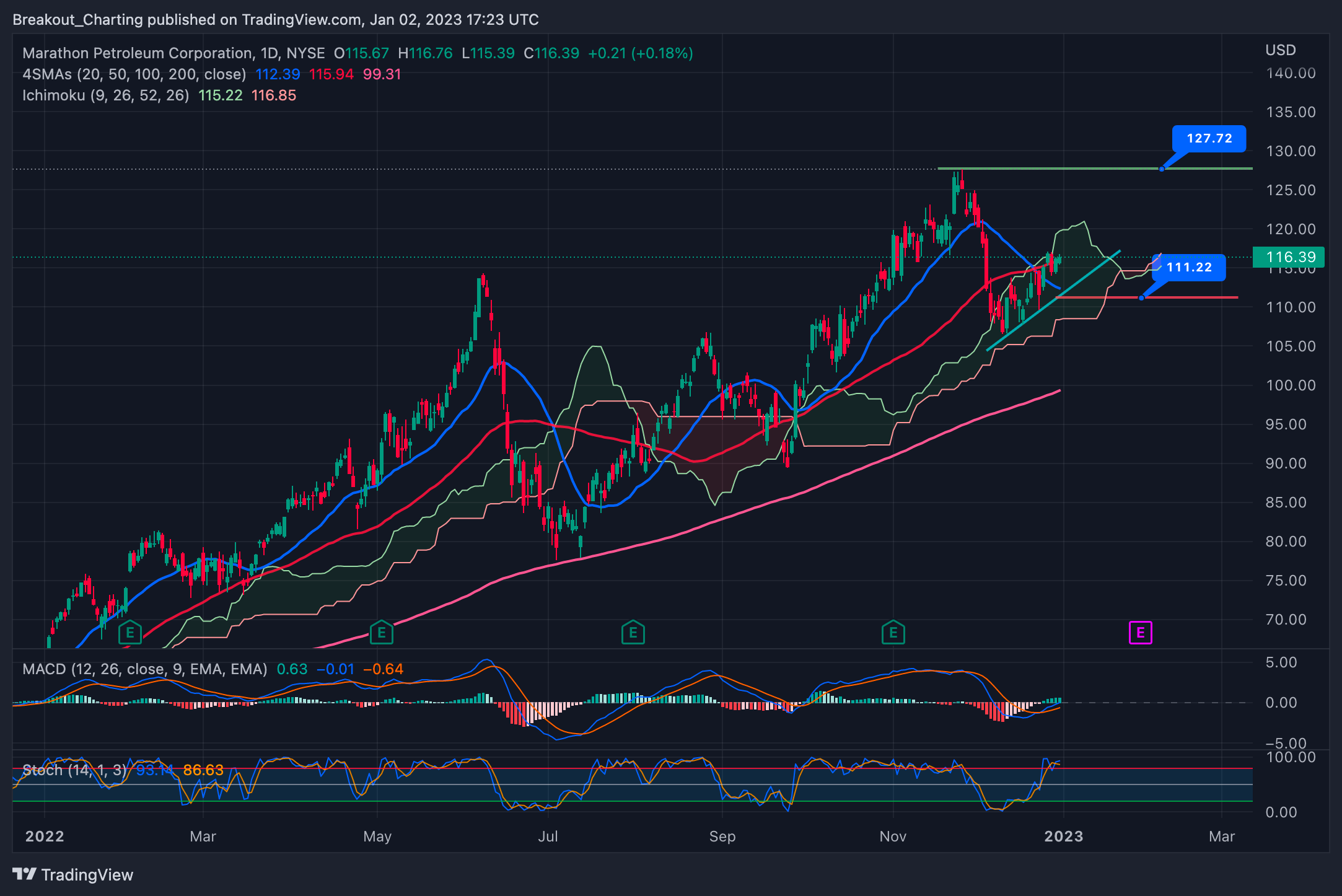 MPC - Marathon Petroleum: Momentum strong, watch out for resistance in cloud, this may retest the 20ma. Target: 127.72 Stop-Loss: 111.22