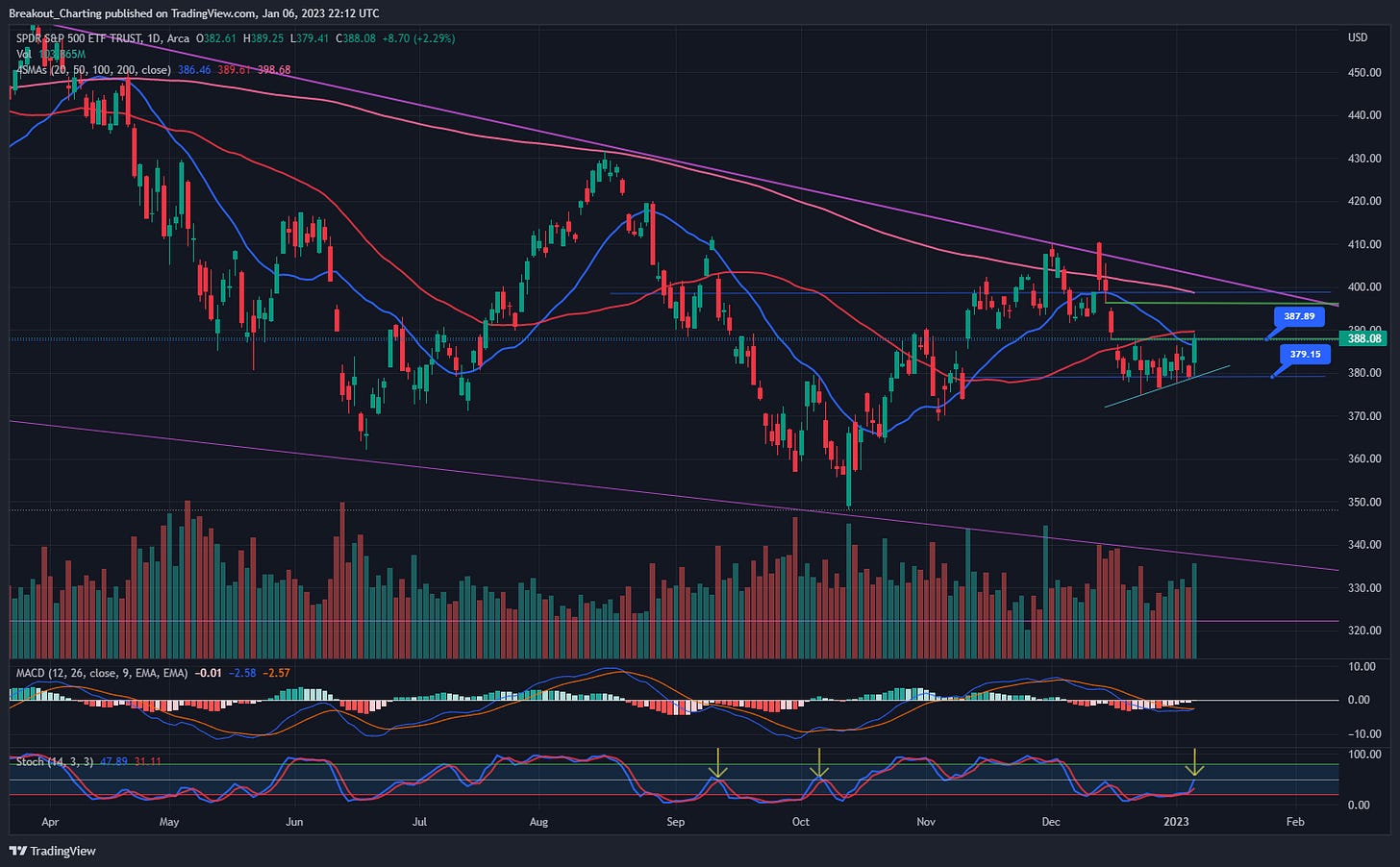 SPY - S&P500 ETF: I was wrong about us breaking downward this week. Today was a strong gain up +2.29% and up almost +1.5% this week. BUT, I do believe as I mentioned last week we’re building out a right shoulder similar to Sept downturn as seen on the weekly, I don’t believe this is a move to build off of. To flip bullish we would need to flip on MACD and continue higher on Stochastic. I think we turn downward in momentum like Sept and Oct (Shown with arrows). Today, we also filled the $387 gap and was rejected by 50ma, 80% of the time after filling a gap we usually reverse so we’ll see if that plays out.